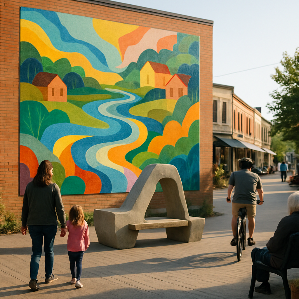 Dieses Mural im Zentrum von Seelbach erzählt die Beziehung der Stadt zum Fluss. Es entstand in Kooperation mit einer regionalen Künstlerin, Schüler*innen und Anwohnern. Das Ergebnis: ein sozialer Ort, an dem Geschichten sichtbar werden. Touristen fotografieren das Werk, Nachbarn pflegen es — ein kleiner Erfolgszyklus.